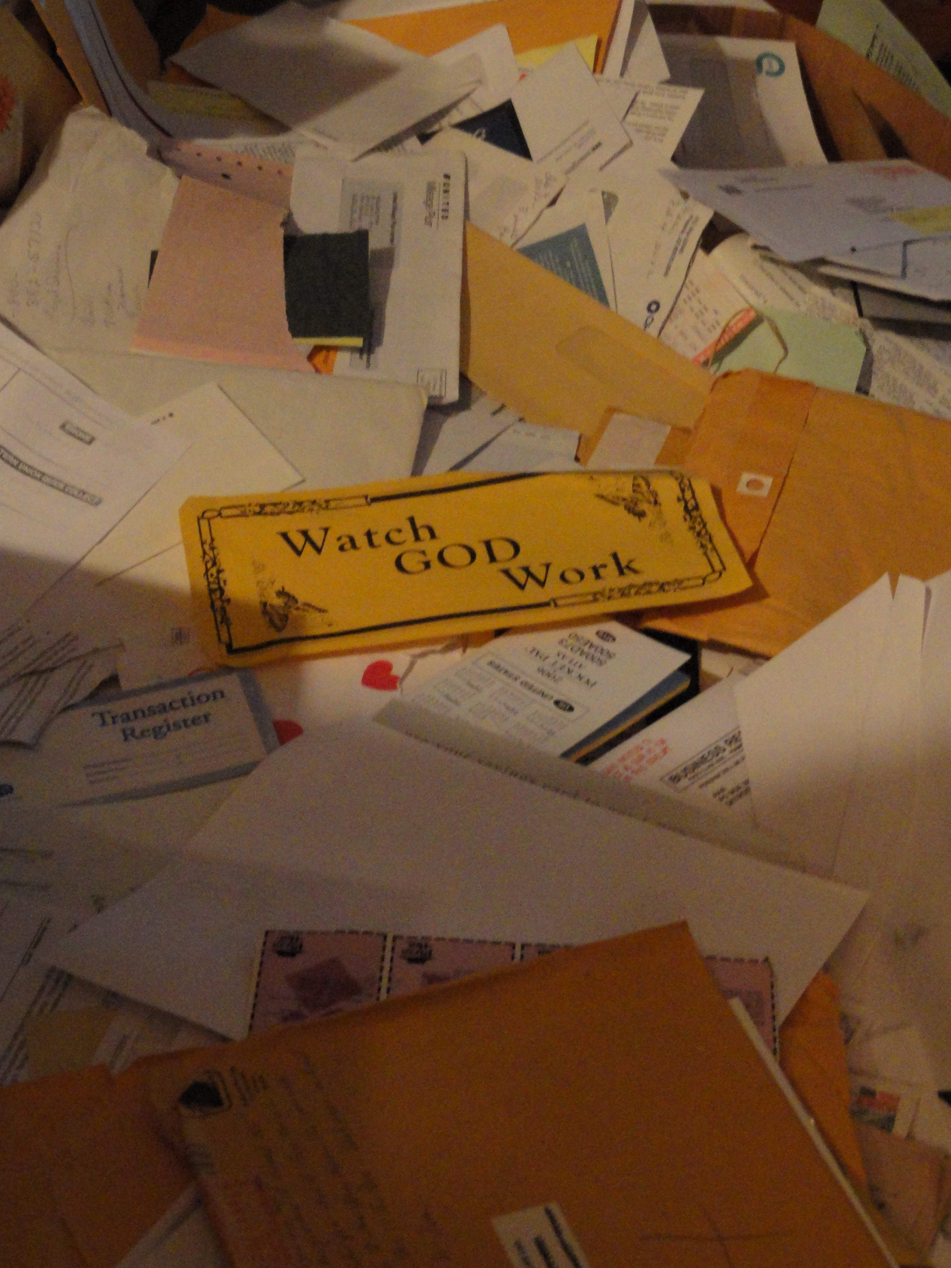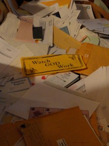 The picture above was an amazing event. I’d been sorting out papers, preparing for a court hearing with my Mom…for over 30 hours straight and was so exhausted. I kind of cried out to the Lord, asking, “What good is all this – how can any of this (to me useless work) produce anything for your glory?” Mindlessly grabbing another stack of papers from a room full of boxes as I prayed, I was startled to see a yellow paper slide out and float down like an autumn leave and land (providentially) on top of the pile reserved for ‘trash’. I couldn’t believe it when I read those words – Watch God Work!