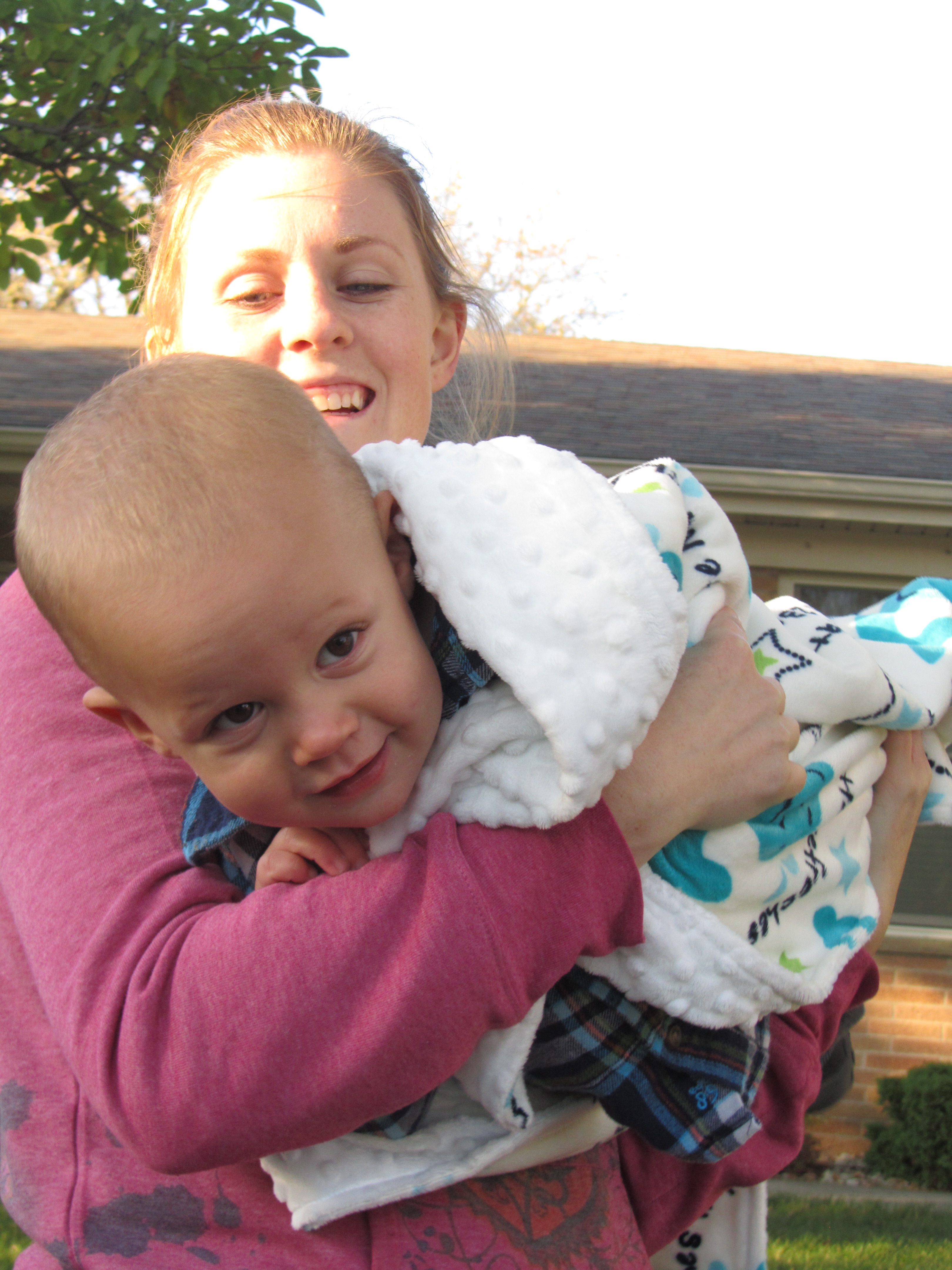 Our Tony is a little cuddler and when he felt the blanket his first instinct was to hug and cuddle it. We took a couple of pictures as their family was preparing for their drive home. Despite being excited and distracted, Tony was drawn to the pictures and the soft-from-the-dryer feel of the Day 7 blanket.
