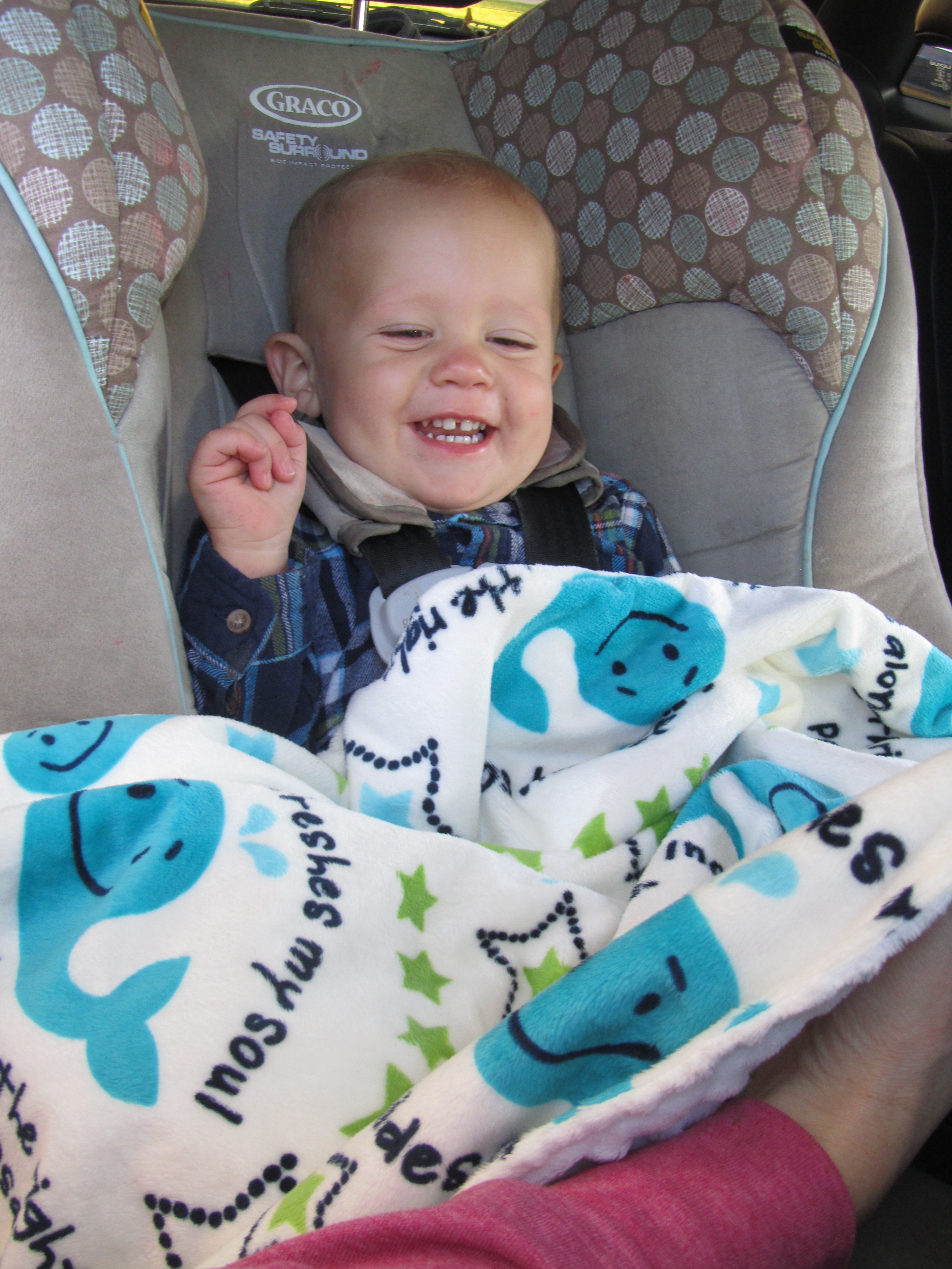 …and he enjoyed snuggling the Day 7 blanket all the way home!