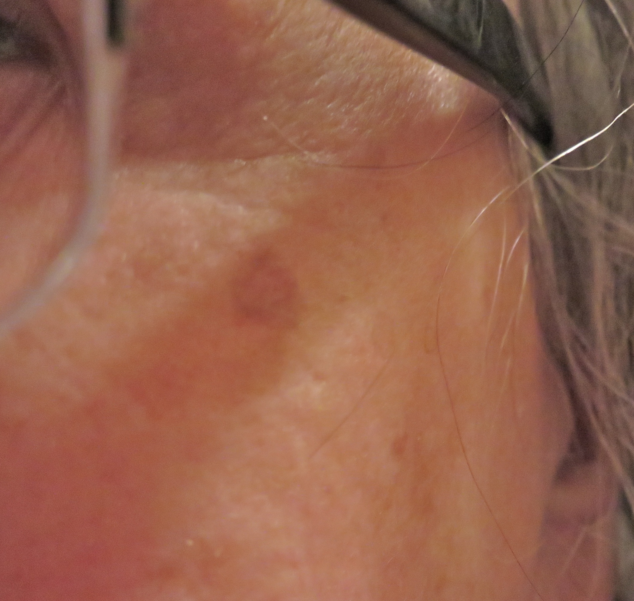 Hyperpigmentation on cheek before Trinity enLIGHTen has faded considerably, though not as much as the larger spot on the forehead