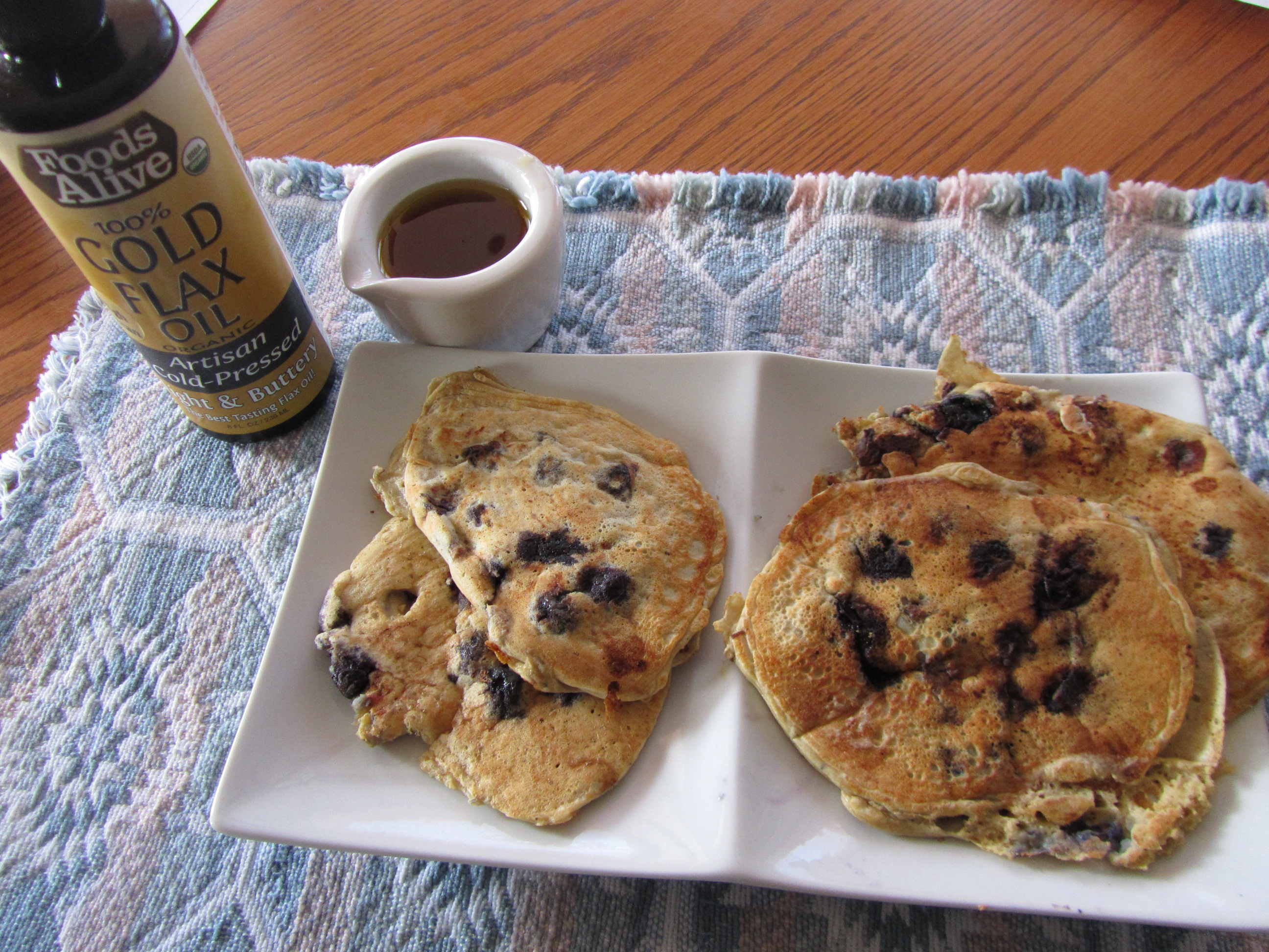 Even my skeptical-about-healthy foods husband loved these (after approaching the plate like it would bite him, and cautiously tasting the pancake with and without my favorite topping (equal amounts Foods Alive Golden Flax Oil and real Maple Syrup). His comment: WOW! These ARE good!